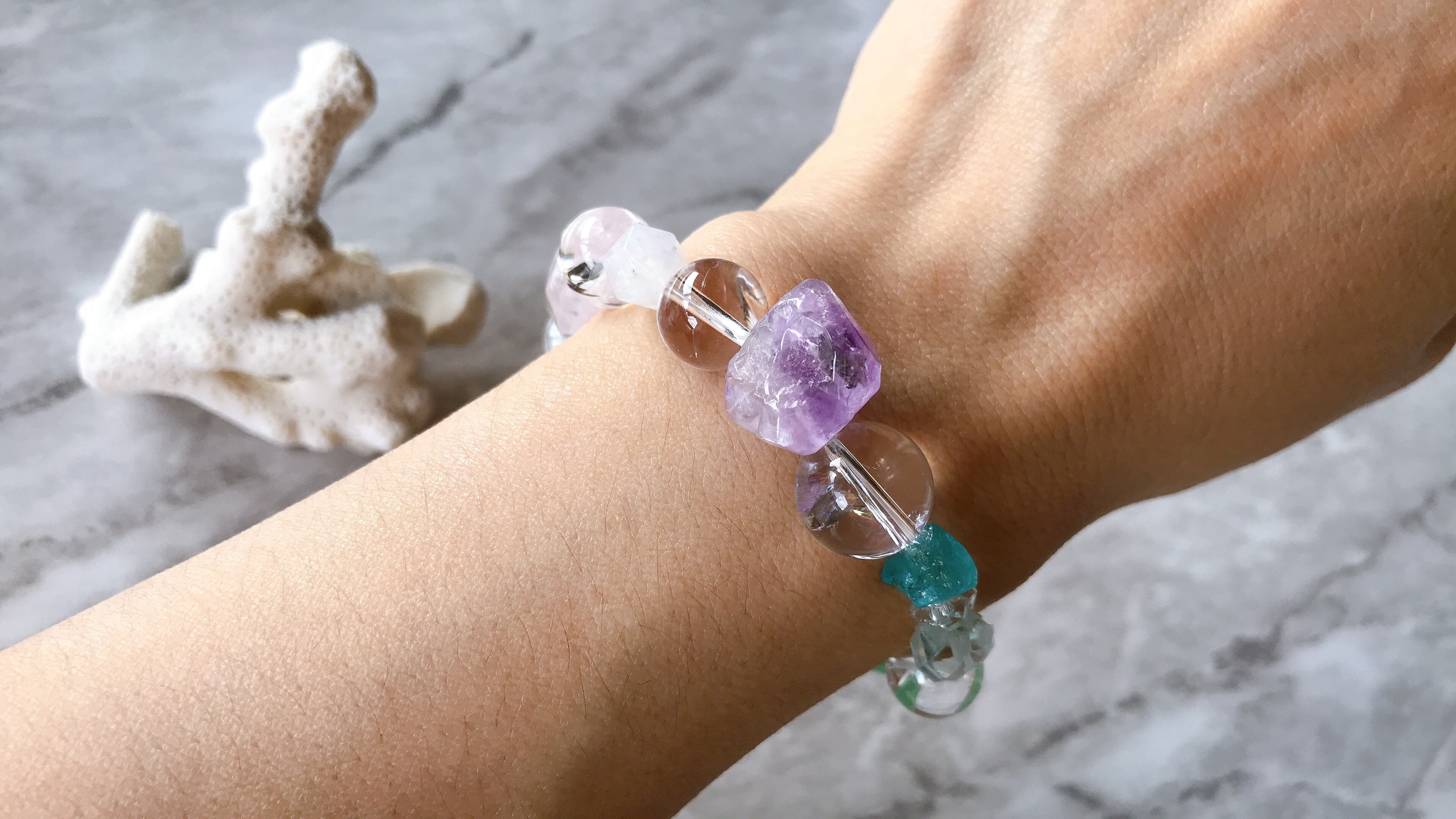 角度によって虹色の輝きを見せてくれる、虹尽くしのブレスレットです。