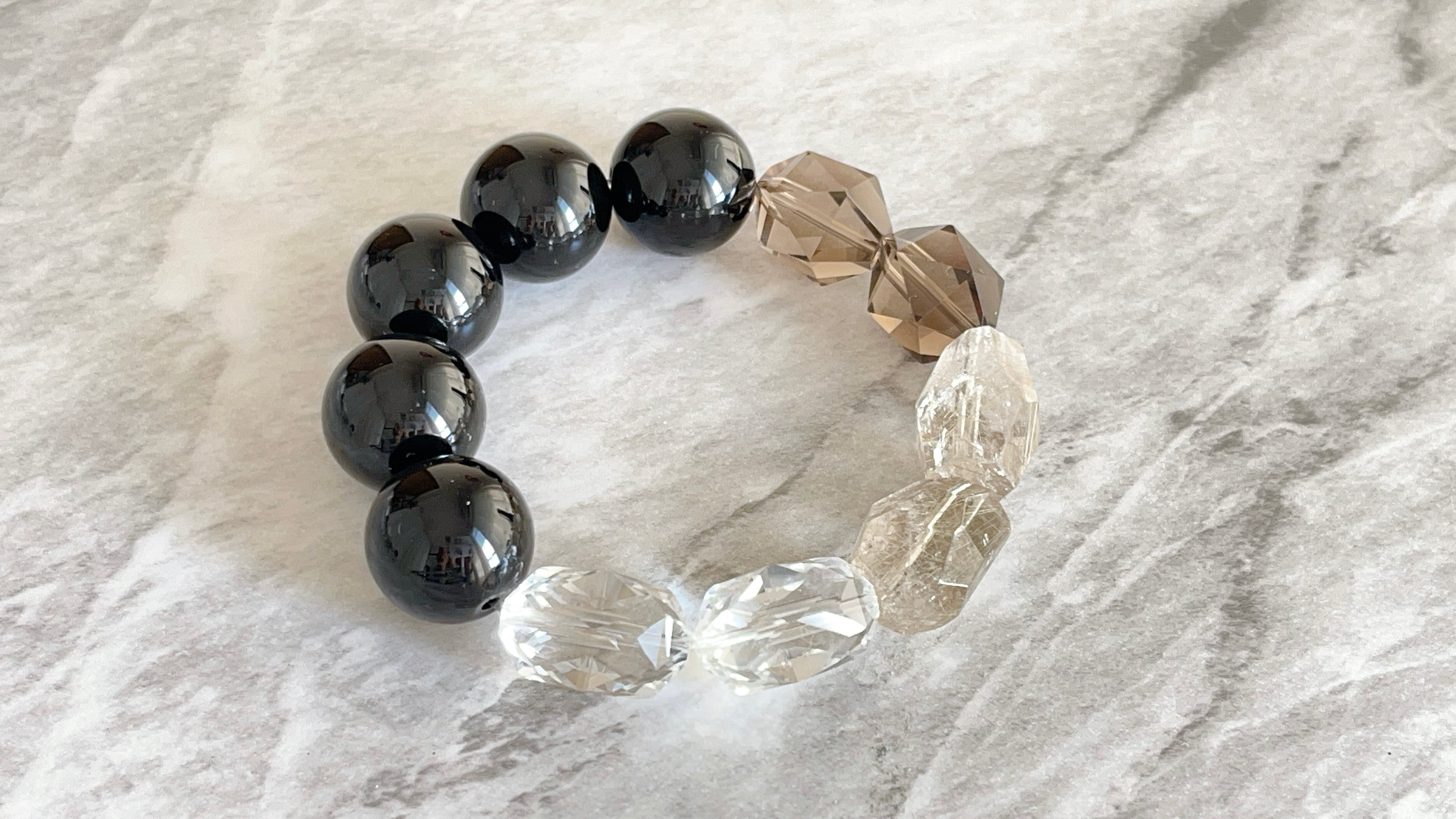 徐々に漆黒のモリオンへとグラデーションになる色合いで繋いでいます。
