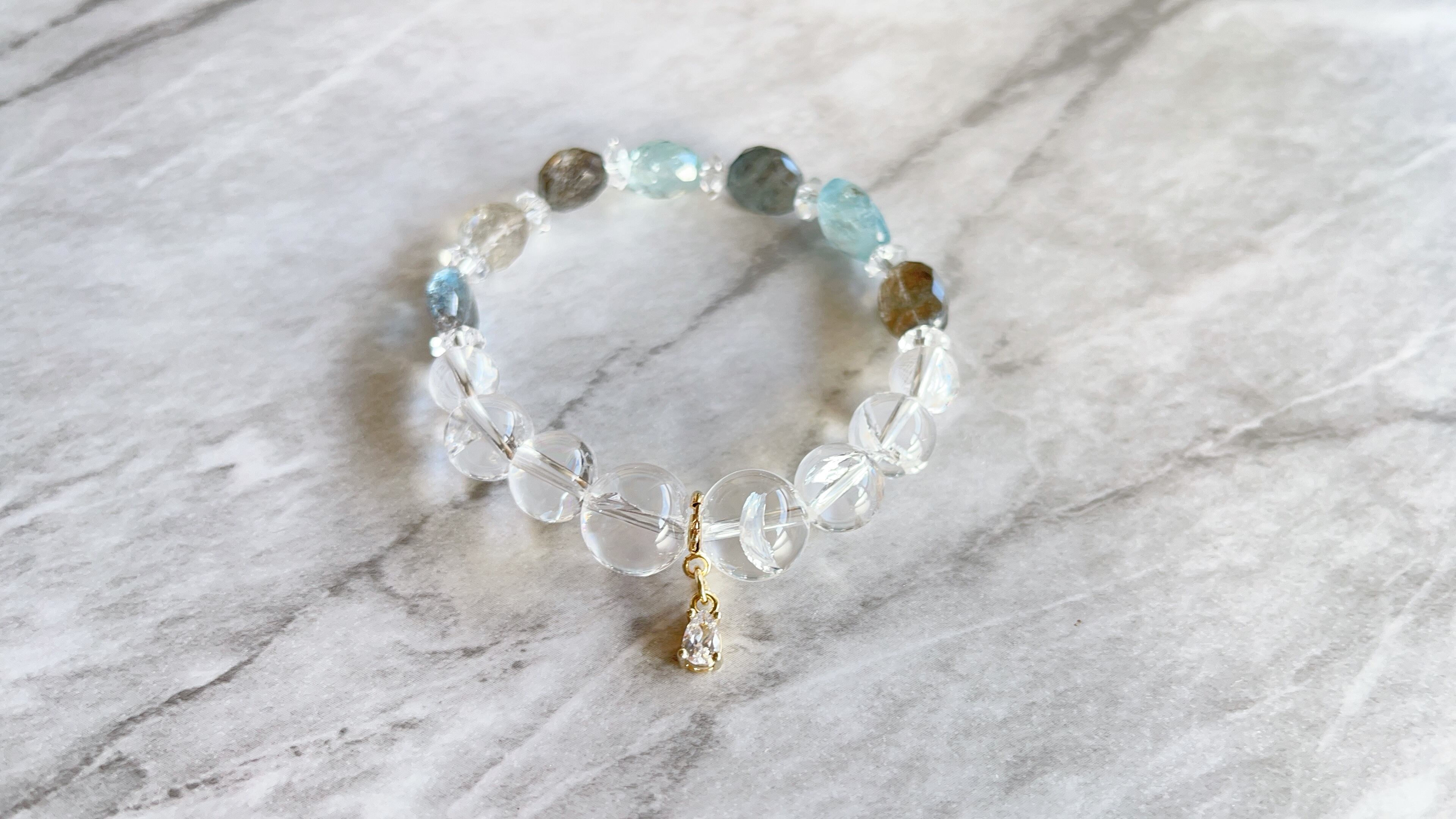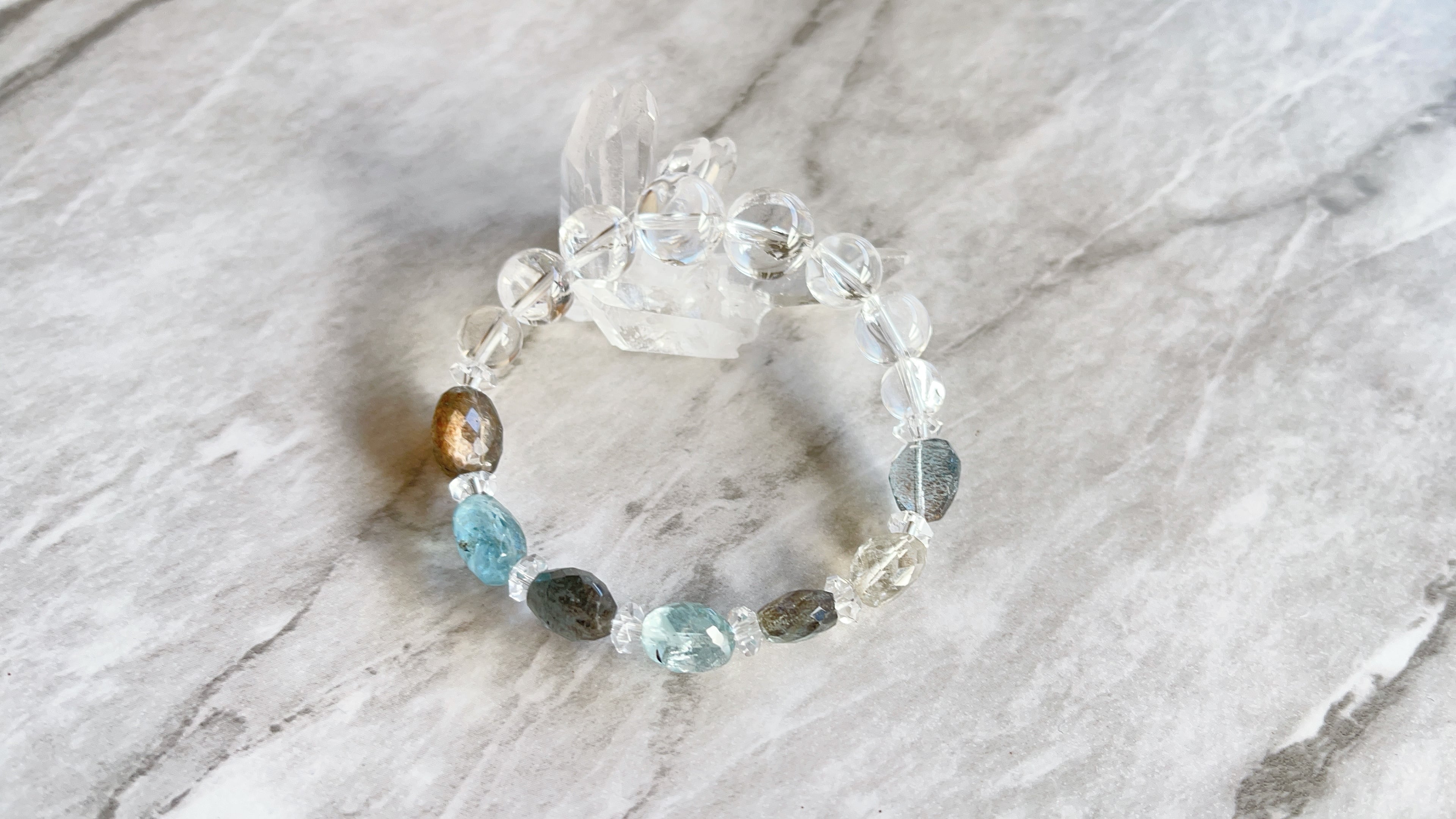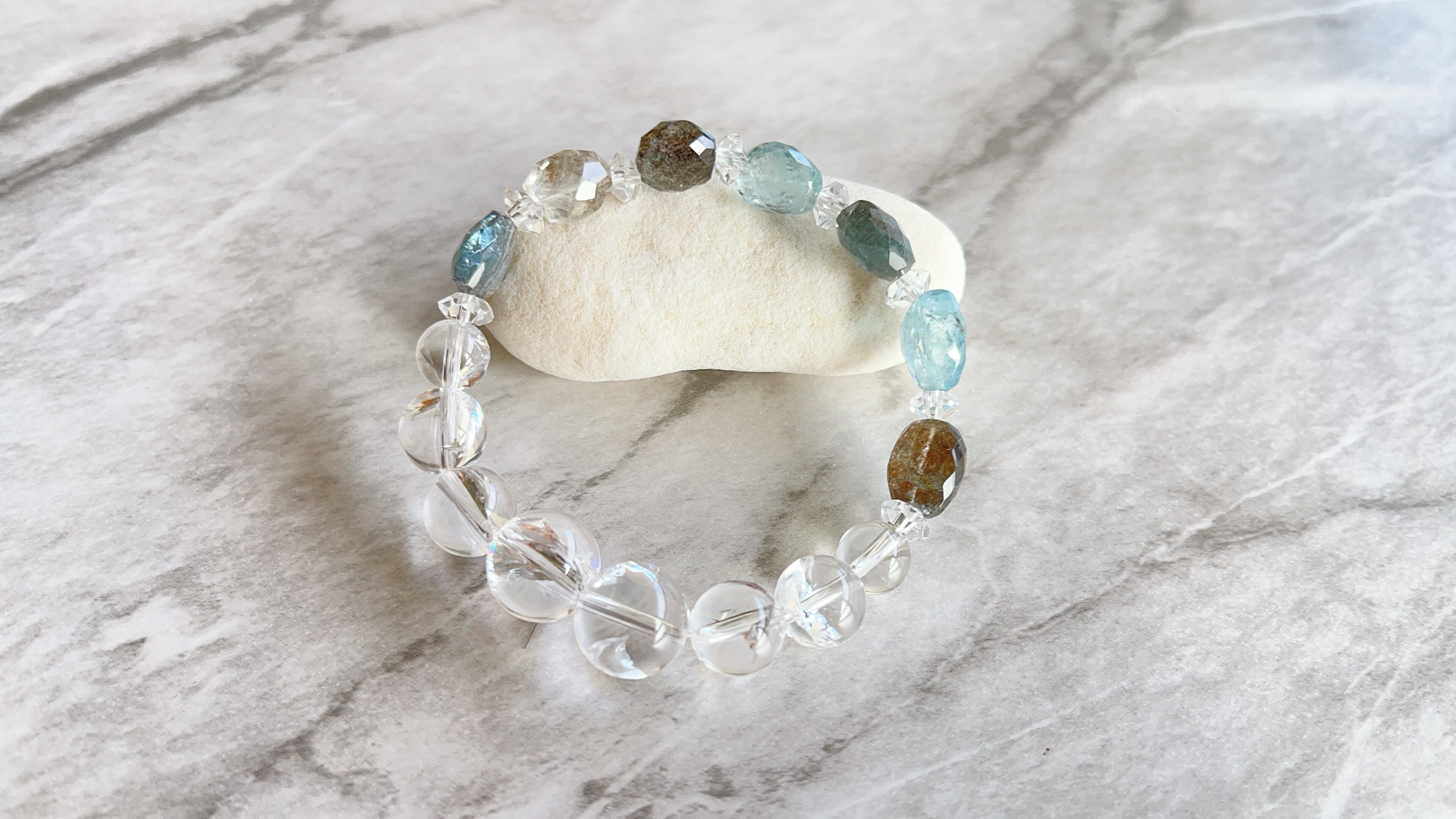 虹の水晶と合わせることで、水の透明感溢れるブレスレットになっています。