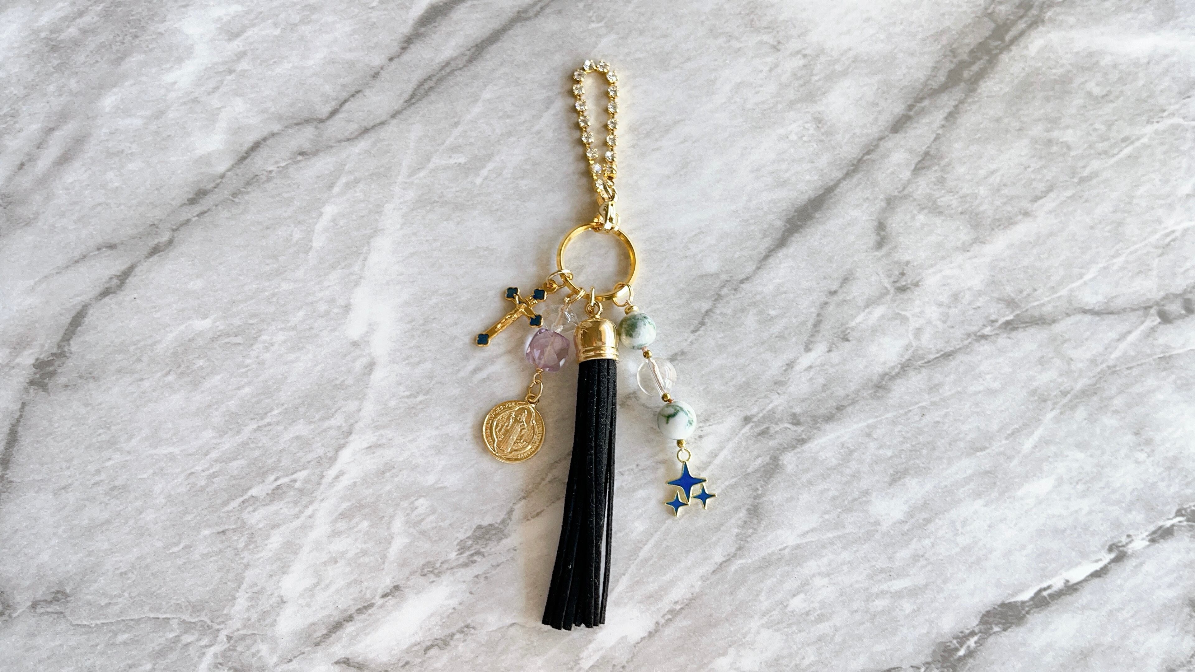選べる11色✧メダイと天然石のタッセル・バッグチャーム✧聖ベネディクト・コイン型Gold ✧ セントベネディクト