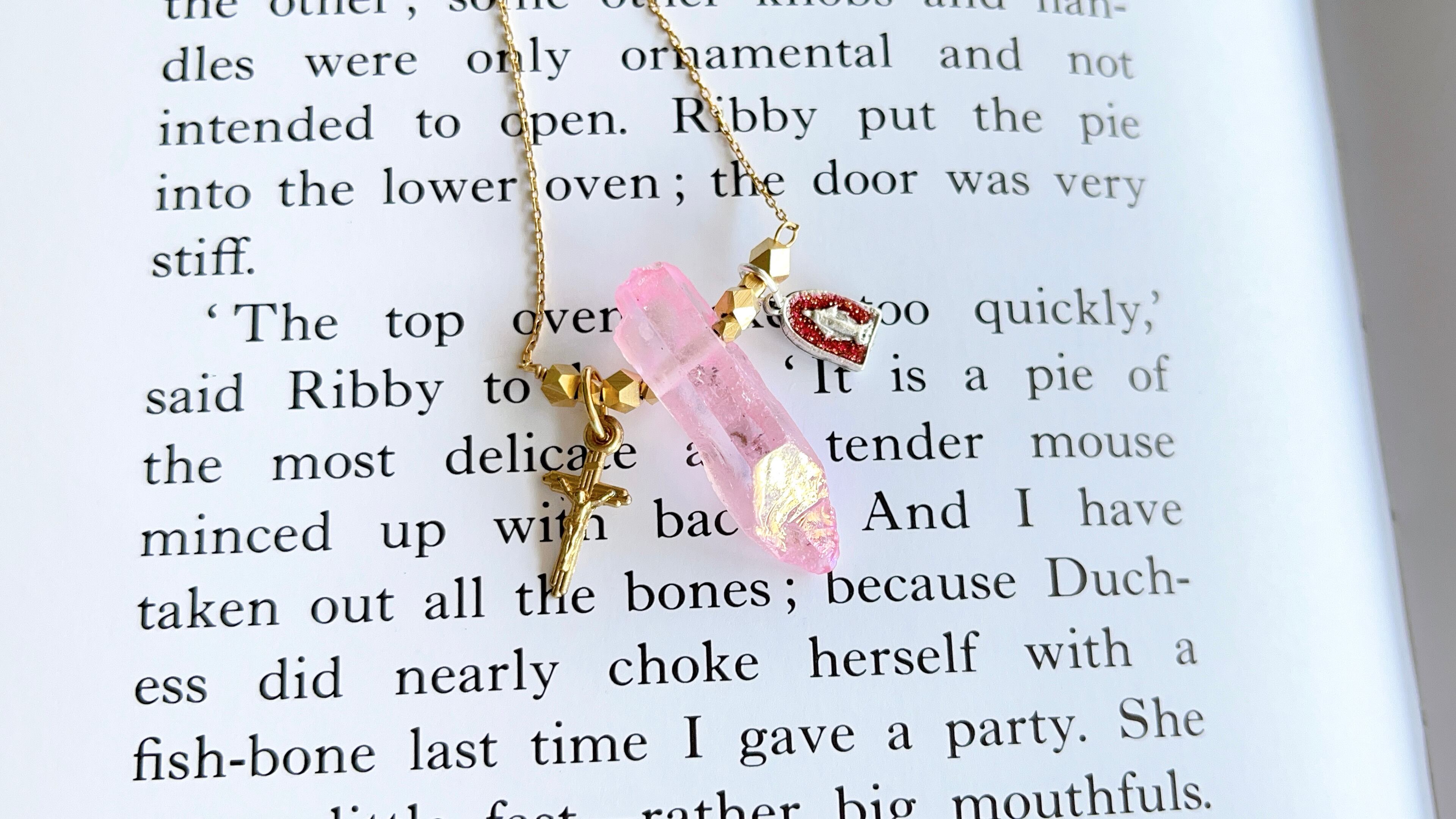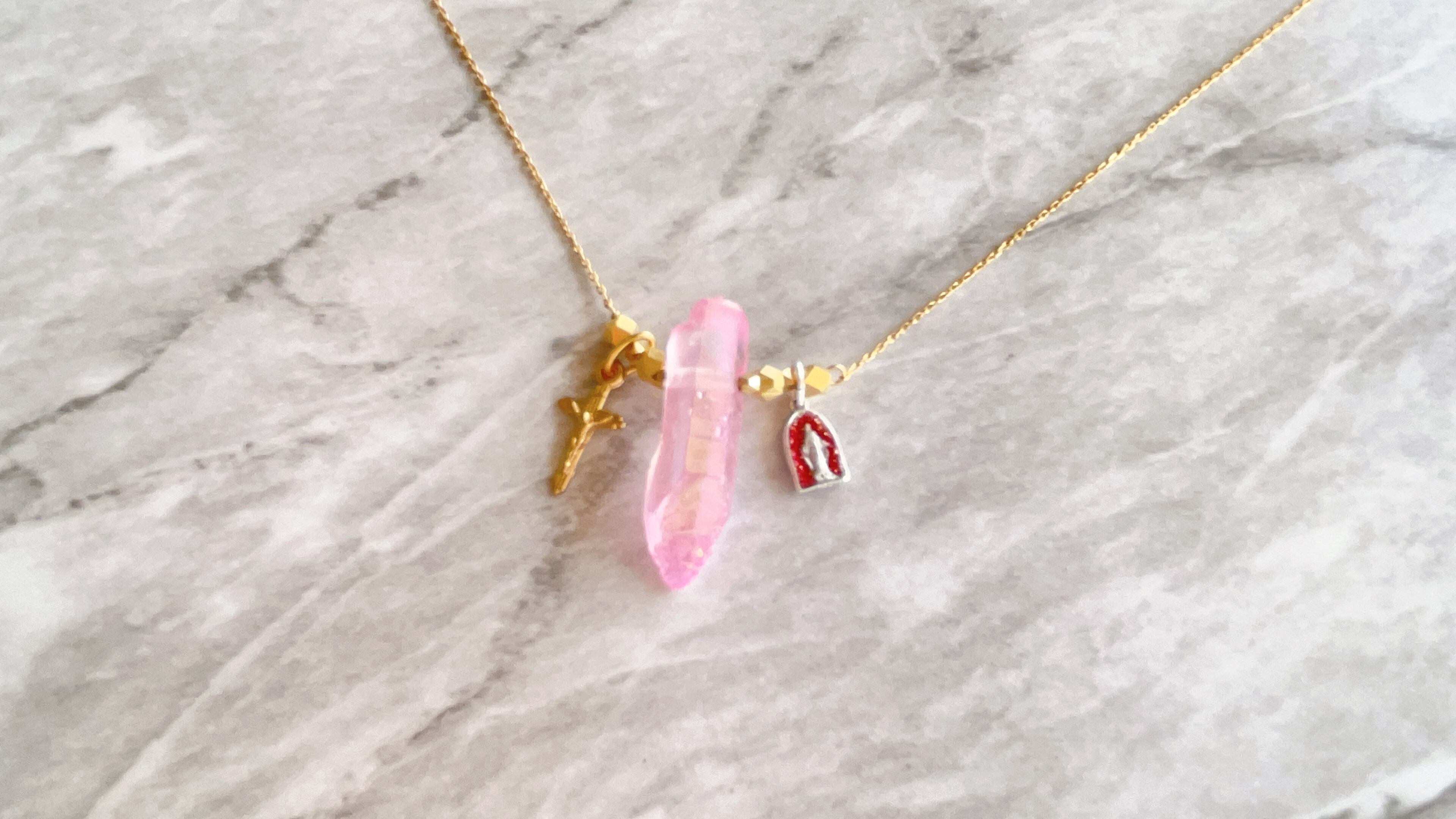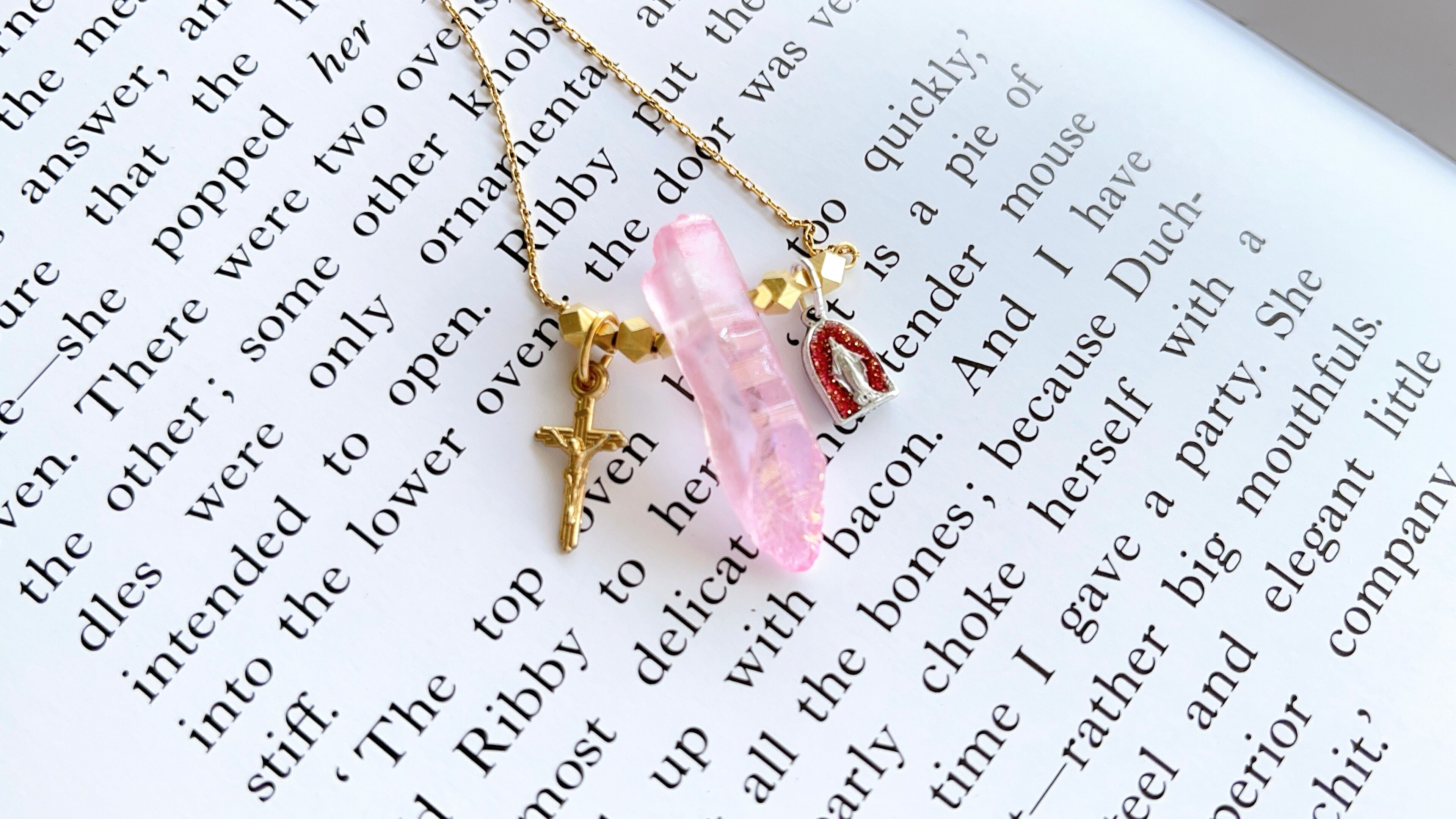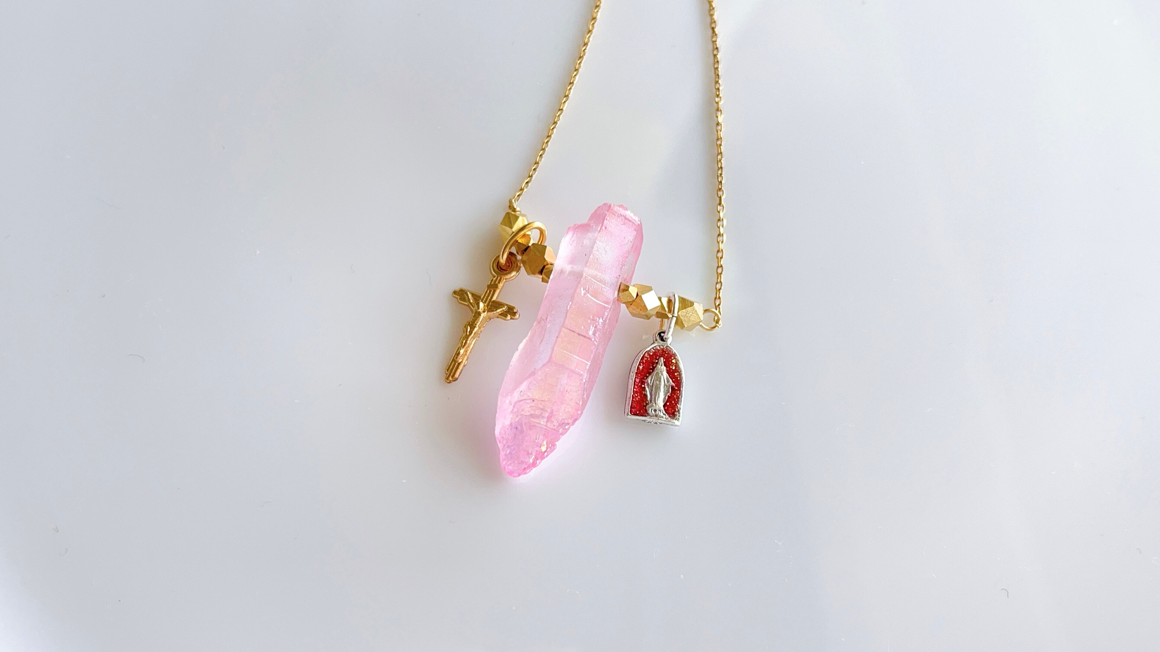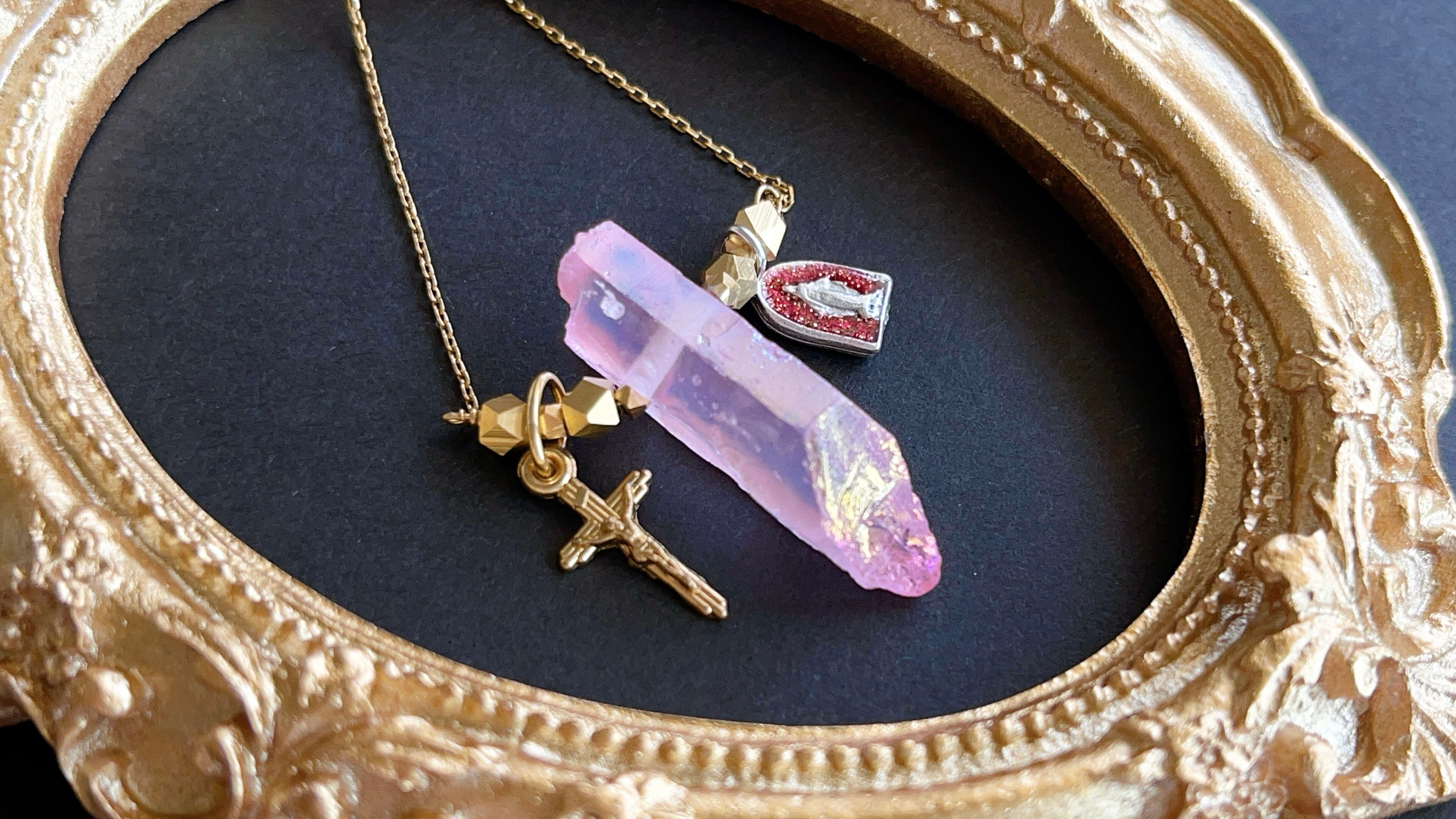 自然な形状を活かしたオーロラピンクのクリスタルを中央に据え、