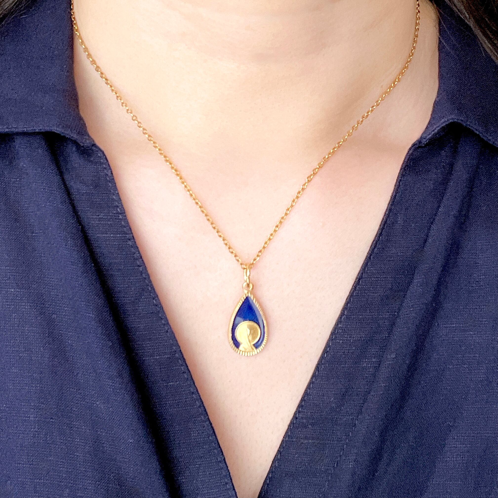 横顔マリア しずく形(金×青)メダイネックレス・サージカルステンレス・長さ調整可