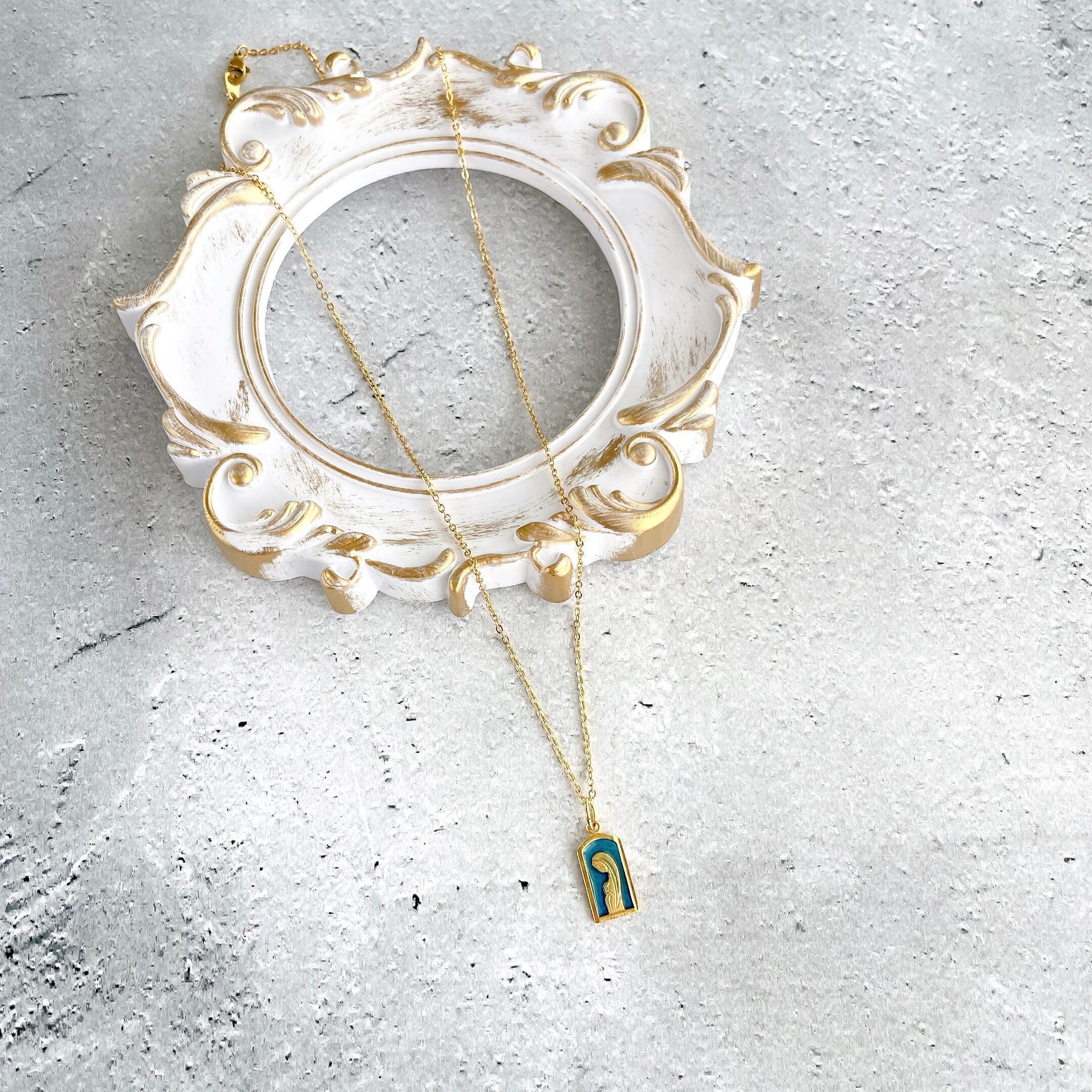 横顔マリア ステンドグラス風 レクタングル マリンブルー メダイネックレスGold・サージカルステンレス・長さ調整可