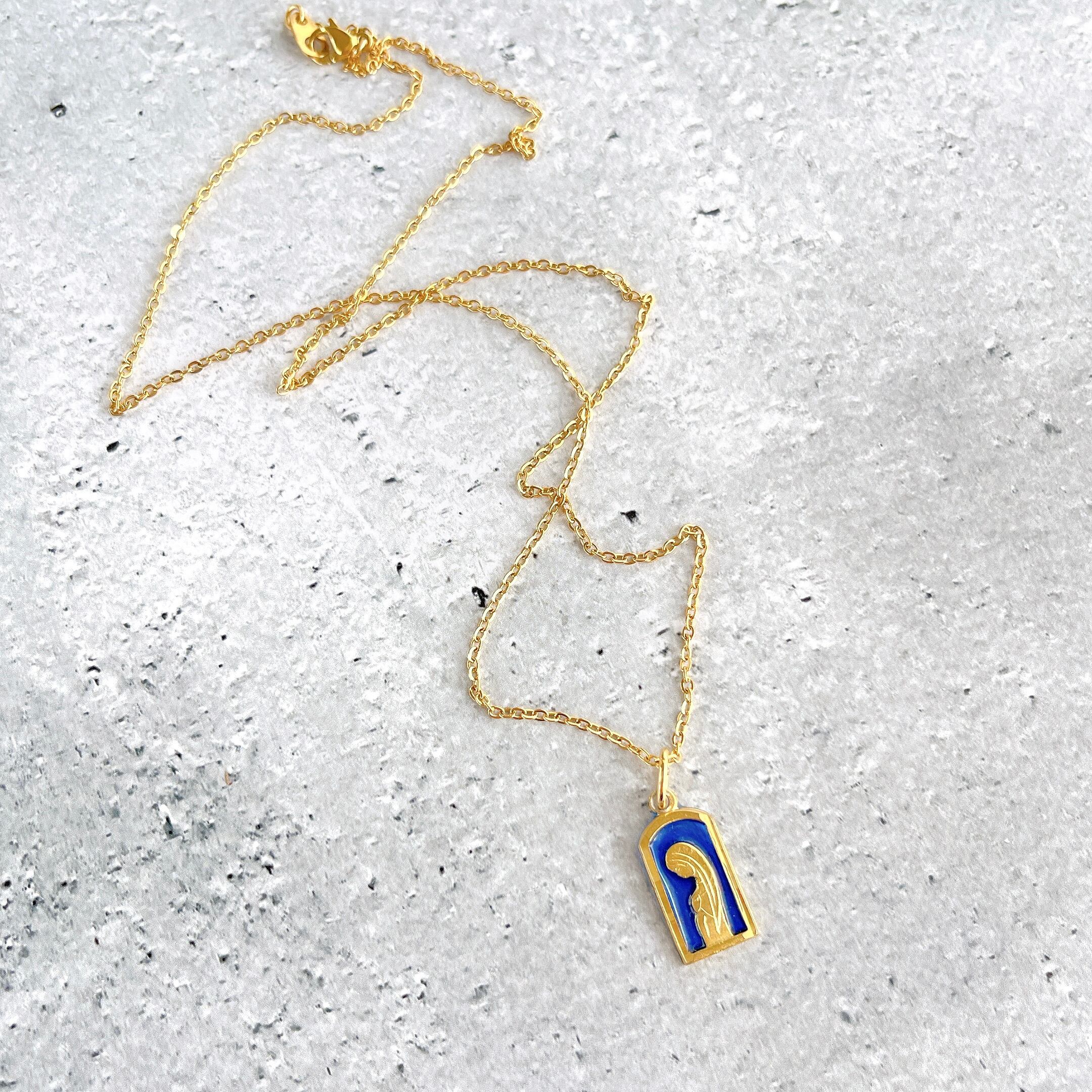 横顔マリア ステンドグラス風 レクタングル ブルー メダイネックレスGold・サージカルステンレス・長さ調整可