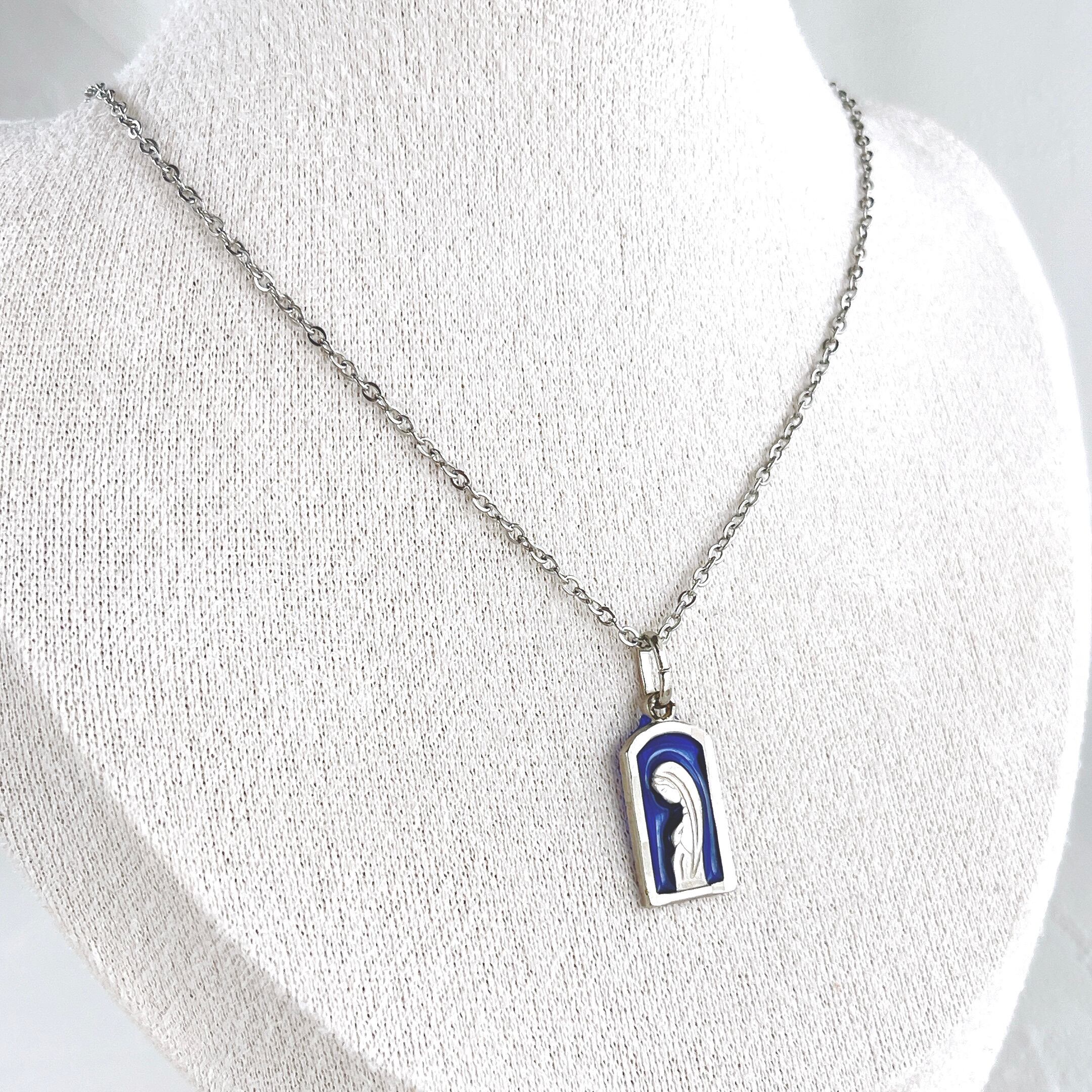 横顔マリア ステンドグラス風 レクタングル ブルー メダイネックレスSilver・サージカルステンレス・長さ調整可
