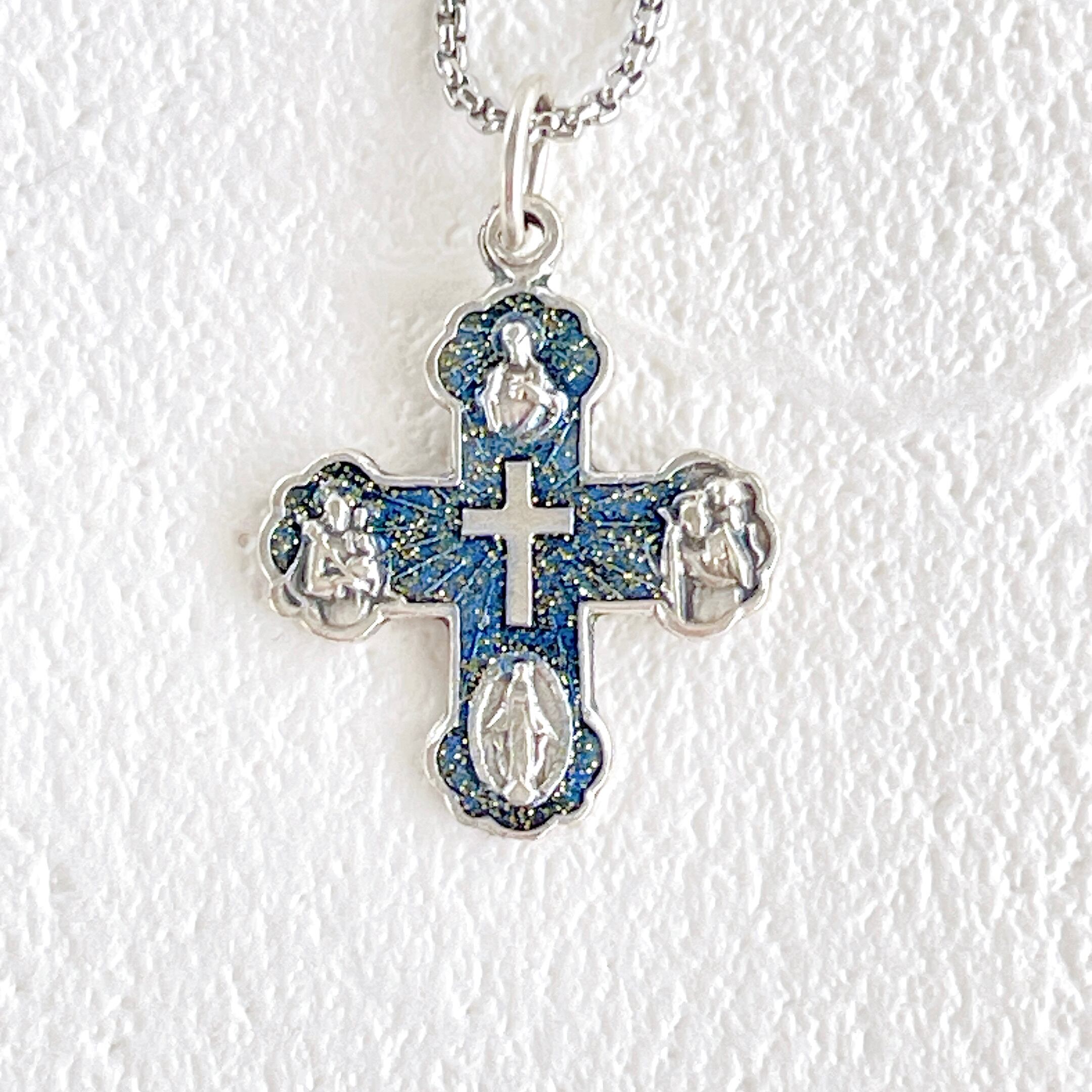 十字架ネックレス【ブルーラメ】4メダイ付き・ベネチアンチェーン50cm・サージカルステンレス・クロスネックレス