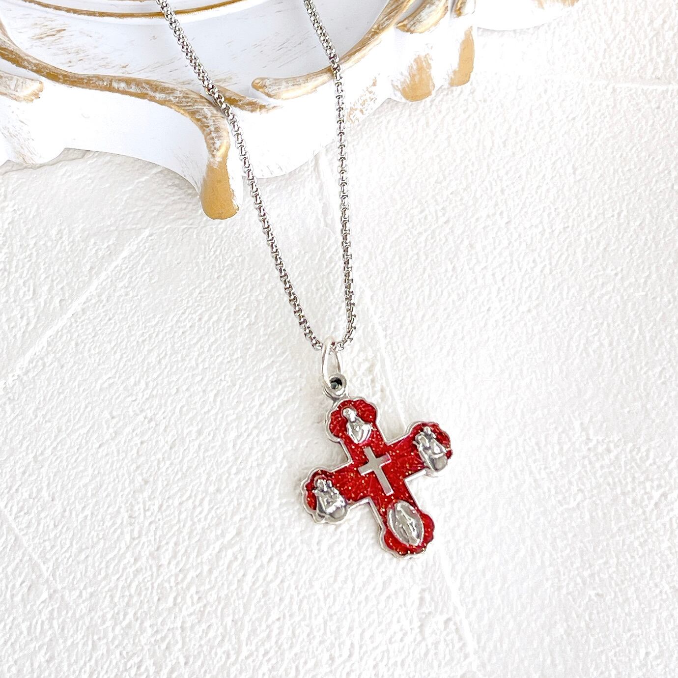 十字架ネックレス【レッドラメ】4メダイ付き・ベネチアンチェーン50cm・サージカルステンレス・クロスネックレス