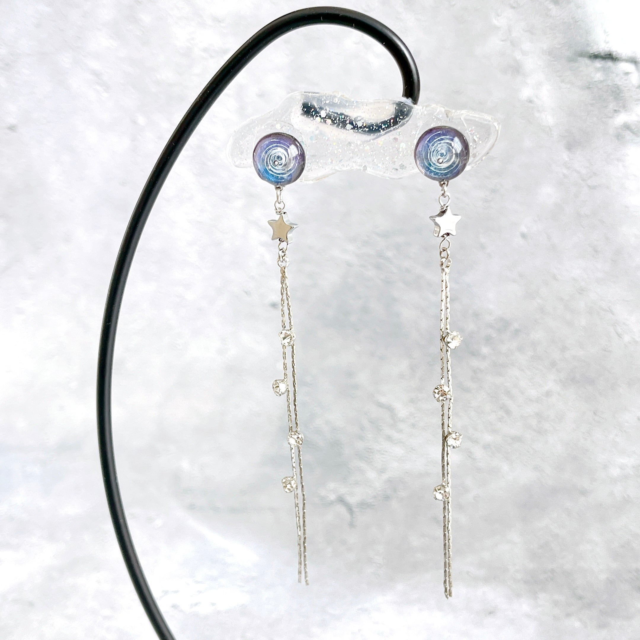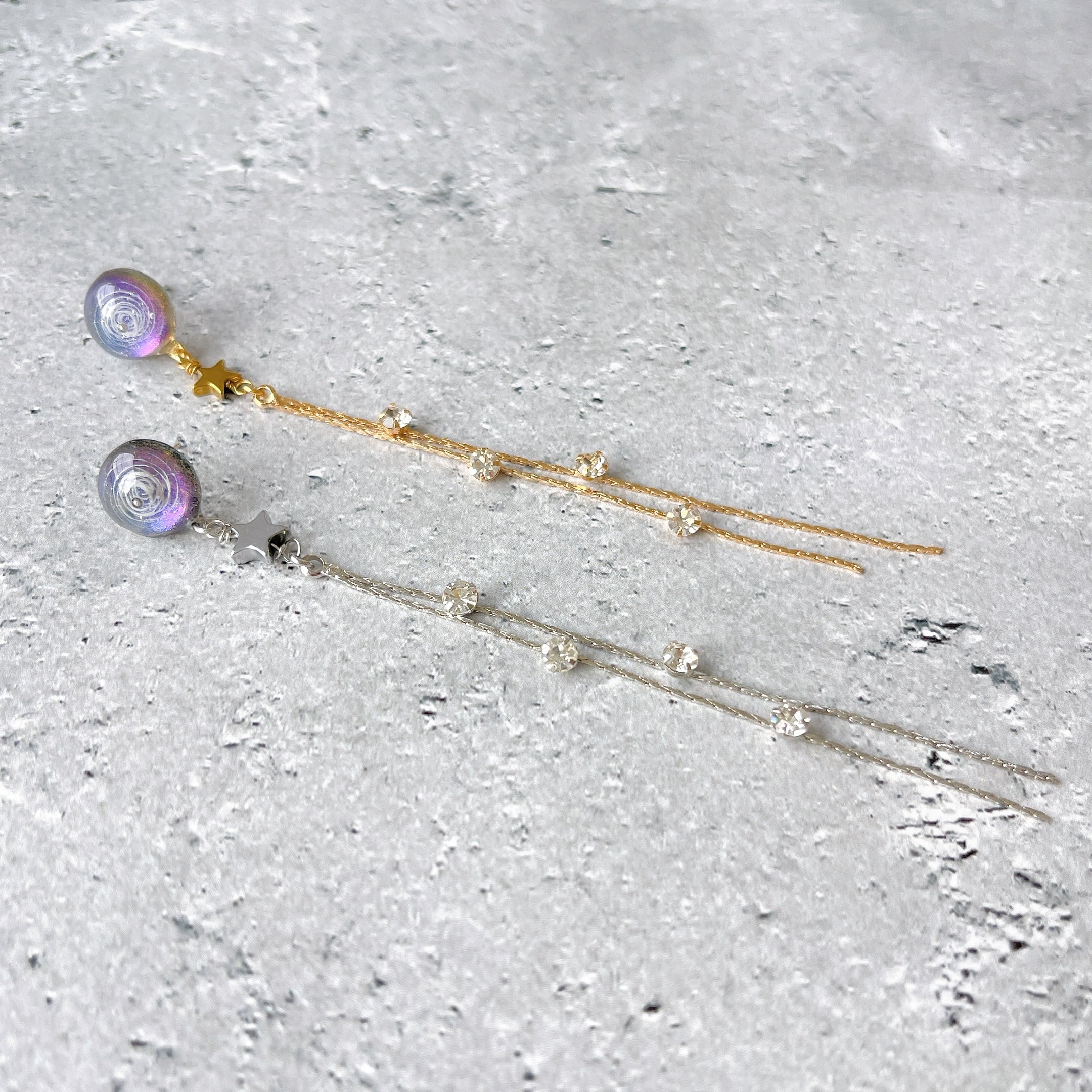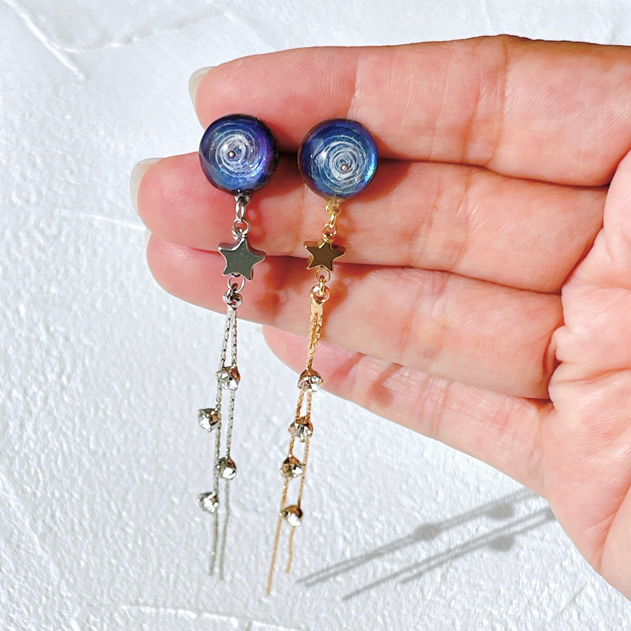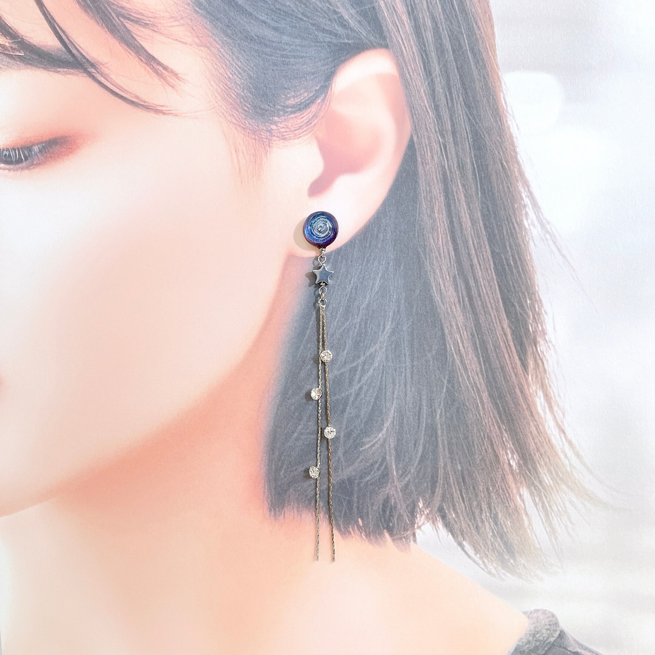 銀河の美しさと流れ星の煌めきをテーマにしたロングピアスです。